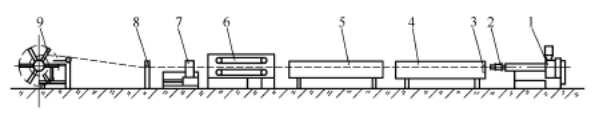 Faoi láthair, is iad píopaí PVC agus PO na táirgí toirte is airde sa bhaile agus go hidirnáisiúnta.Fíor 1taispeánann sé léaráid sreafa an phróisis táirgthe do phíopaí polyolefin (PO). Cothaítear plaisteach isteach sa dísle bearna annular (2) ag an scriú mar leá aonfhoirmeach plaisteachithe, ag easbhrú le parison píopa. Téann sé seo isteach láithreach san aonad calabrúcháin (3) le haghaidh fuaraithe agus méide, agus ansin téann sé faoi fhuarú leordhóthanach san umar fuaraithe (4). Tá an píopa ceirteacha tarraingthe amach ag luas tairiseach ag an inchoigeartaitheaonad tarlaithe(6), agus ar deireadh gearrtha go faid sonraithe ag an gearrthóir (7). Is féidir le píopaí ballaí tanaí a bhfuil trastomhais faoi bhun 160mm acu a bheith coiled isteach i rollaí ag an winder (9).